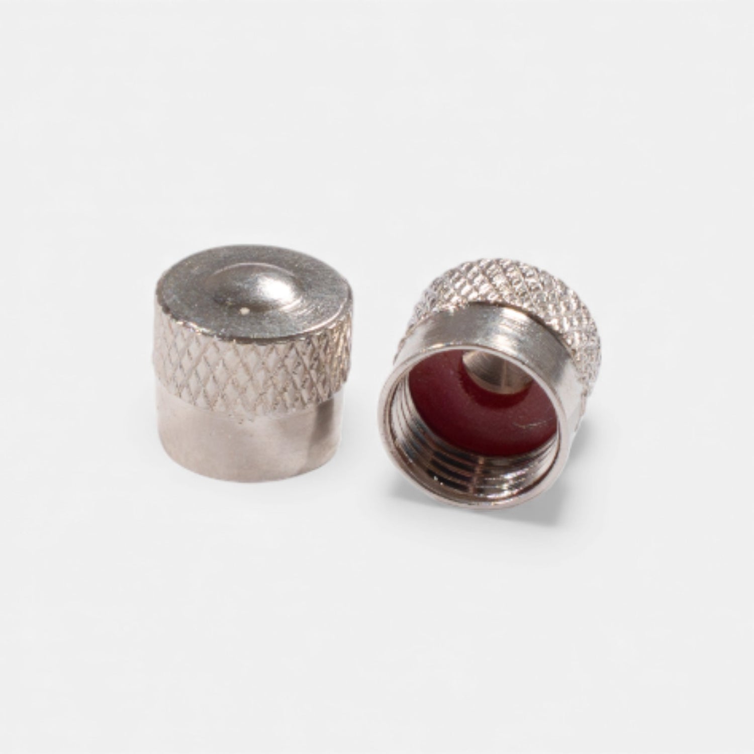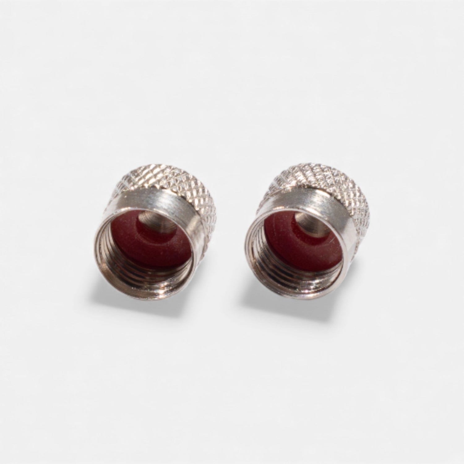Pair of two short, silver anodized aluminum valve caps , designed to effectively protect your Schrader valves from dust, moisture, and minor impacts. Their compact size remains discreet on the wheel while being easy to handle thanks to their anti-slip knurling.