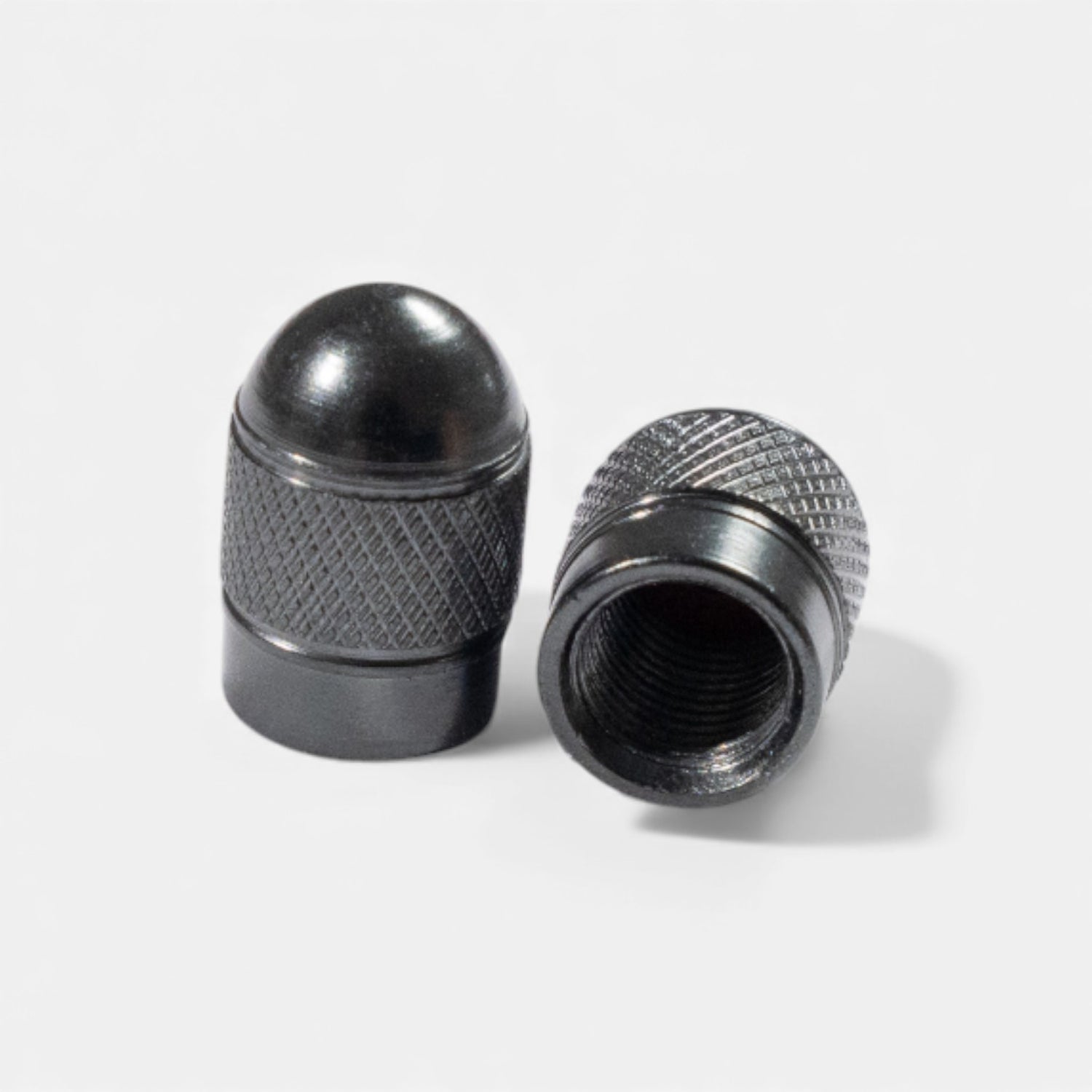 Pair of two round, gray anodized aluminum valve caps , designed to protect your Schrader valves from dust, moisture, and minor impacts. The anti-slip knurling ensures easy and precise tightening.