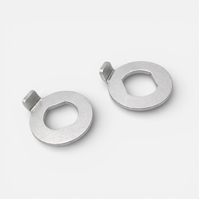 This washer locks the rear axle in place to prevent unwanted rotation or movement during acceleration and braking. It contributes to wheel stability and ensures a secure attachment, essential for safe riding.